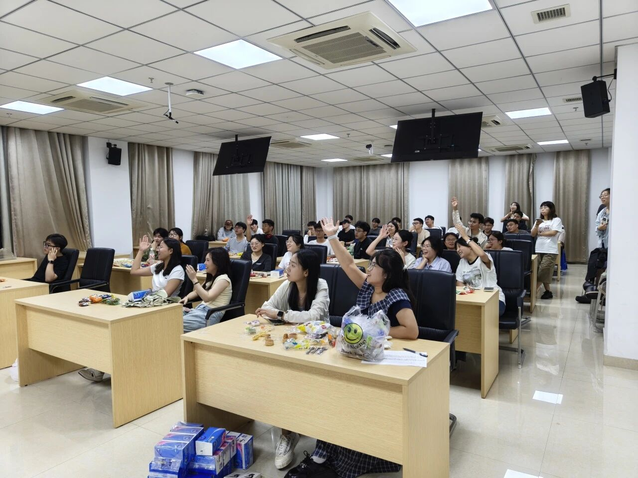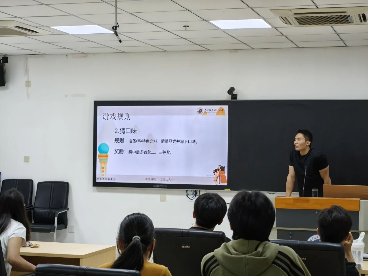 活动现场灯笼高挂,气氛温馨热烈。“猜口味”环节率先点燃全场热情,同学们通过观察和品尝,竞猜各式经典与创新口味的月饼馅料,妙语连珠,笑声不断。“数字炸弹”游戏紧张刺激,极大地考验了大家的反应与运气,将活动氛围推向高潮。随后的“猜灯谜”环节融知识性与趣味性于一体,同学们在破解诗词、成语谜题的过程中,深入感受了传统文化的深厚底蕴。
